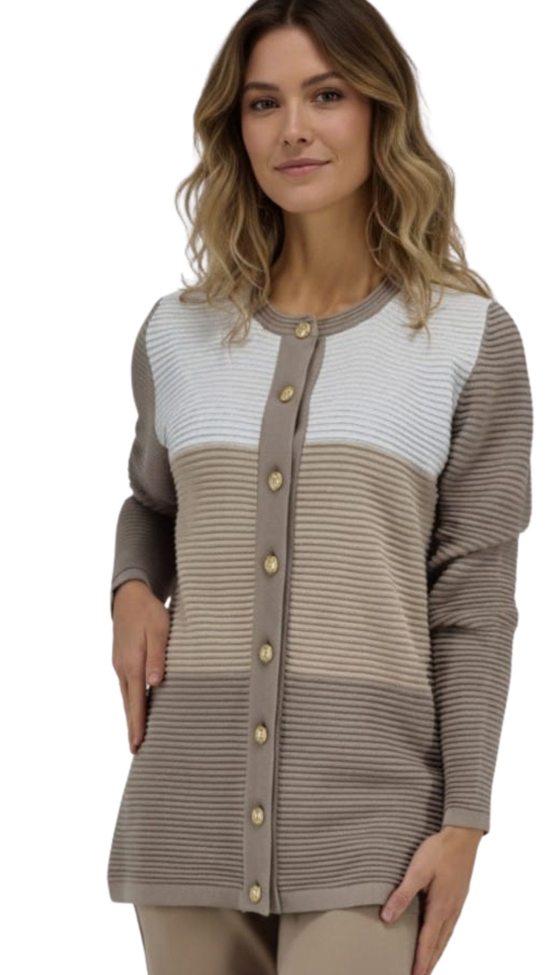Cardigan lungo a righe di tre colori, Bianco e gradazioni Nocciola