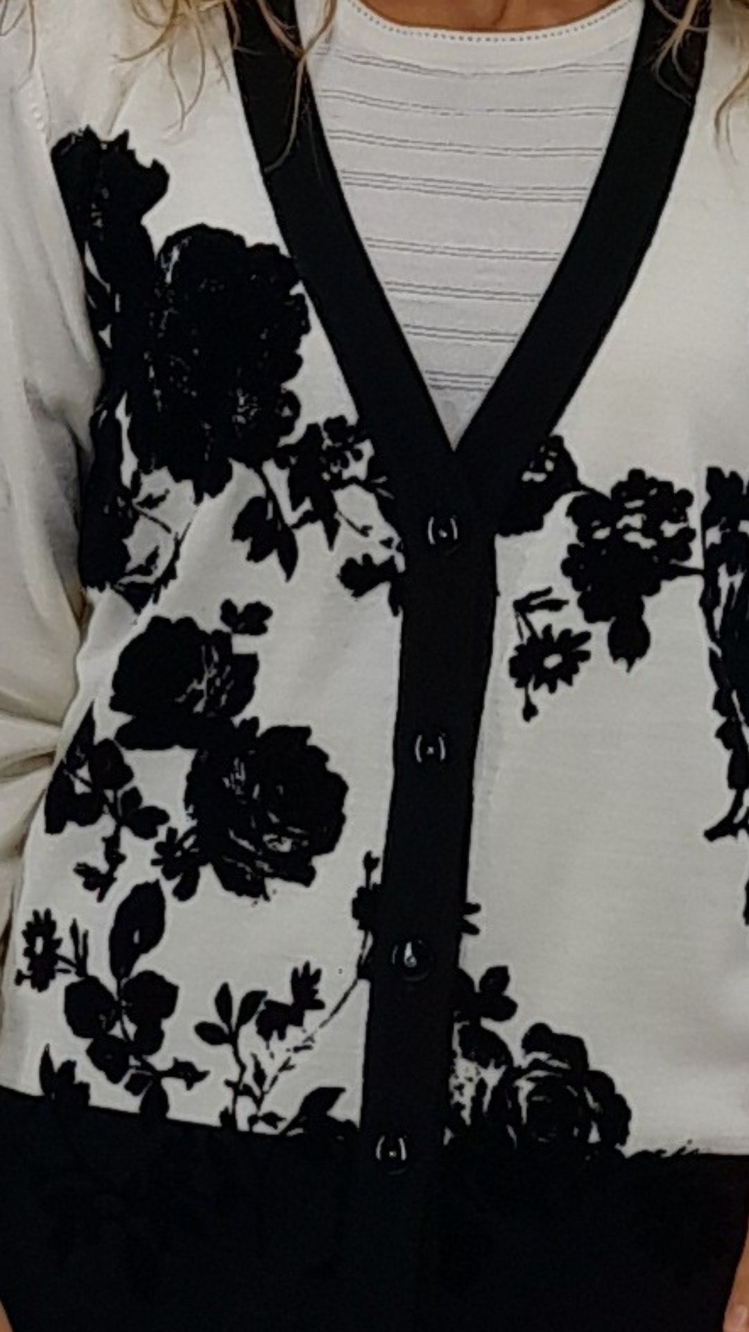 Cardigan di colore Bianco con lavorazione flok di colore nero sul davanti, motivo floreale.