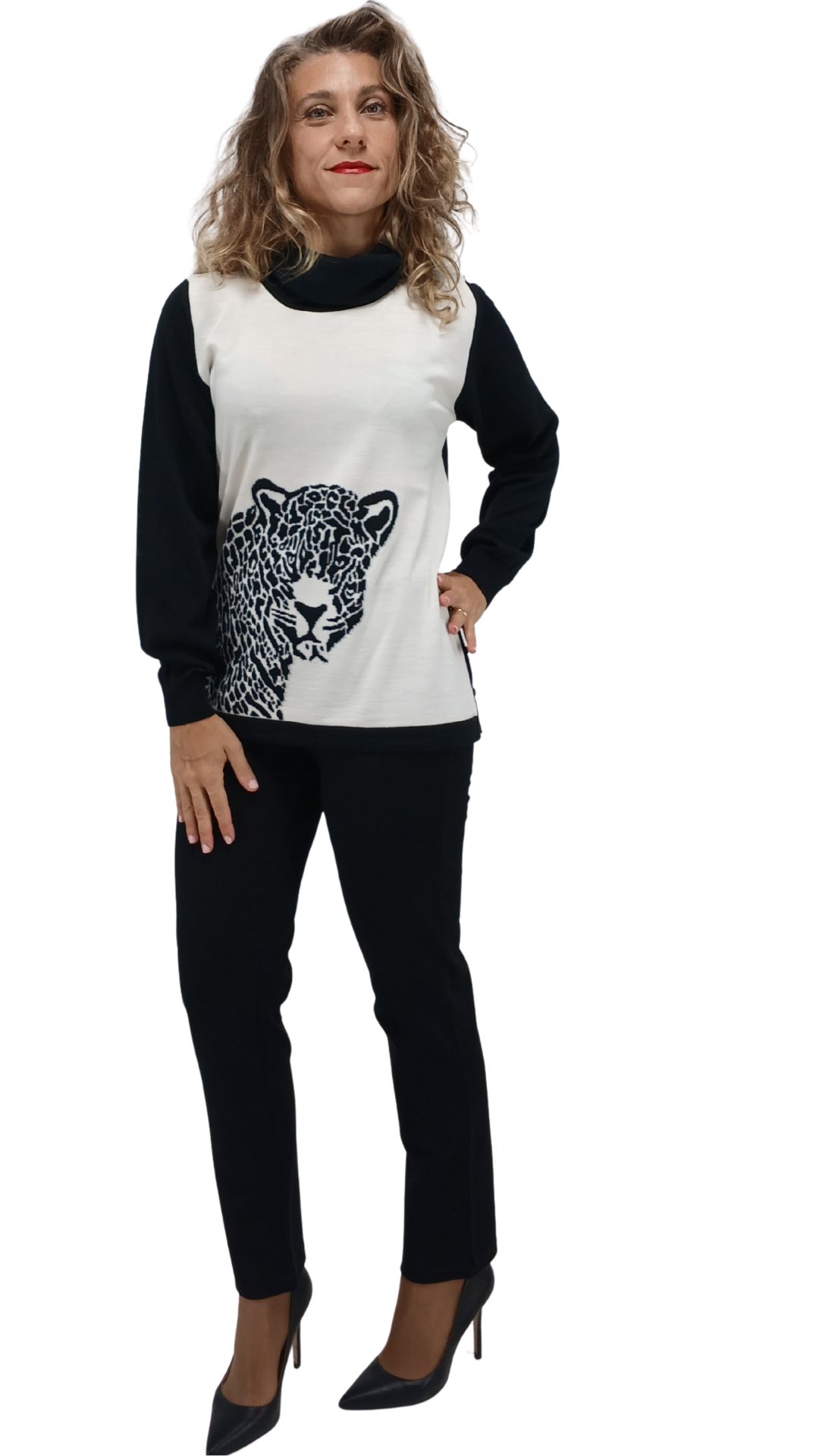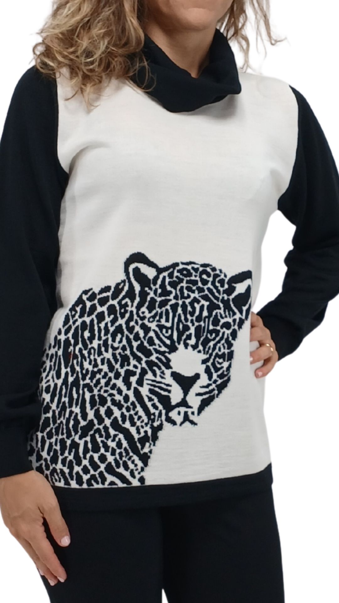 Maglia dolcevita davanti lavorazione intarsio motivo leopardo