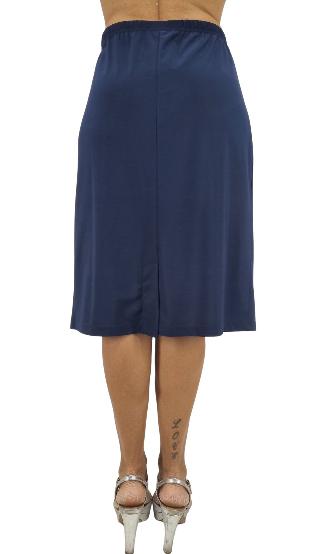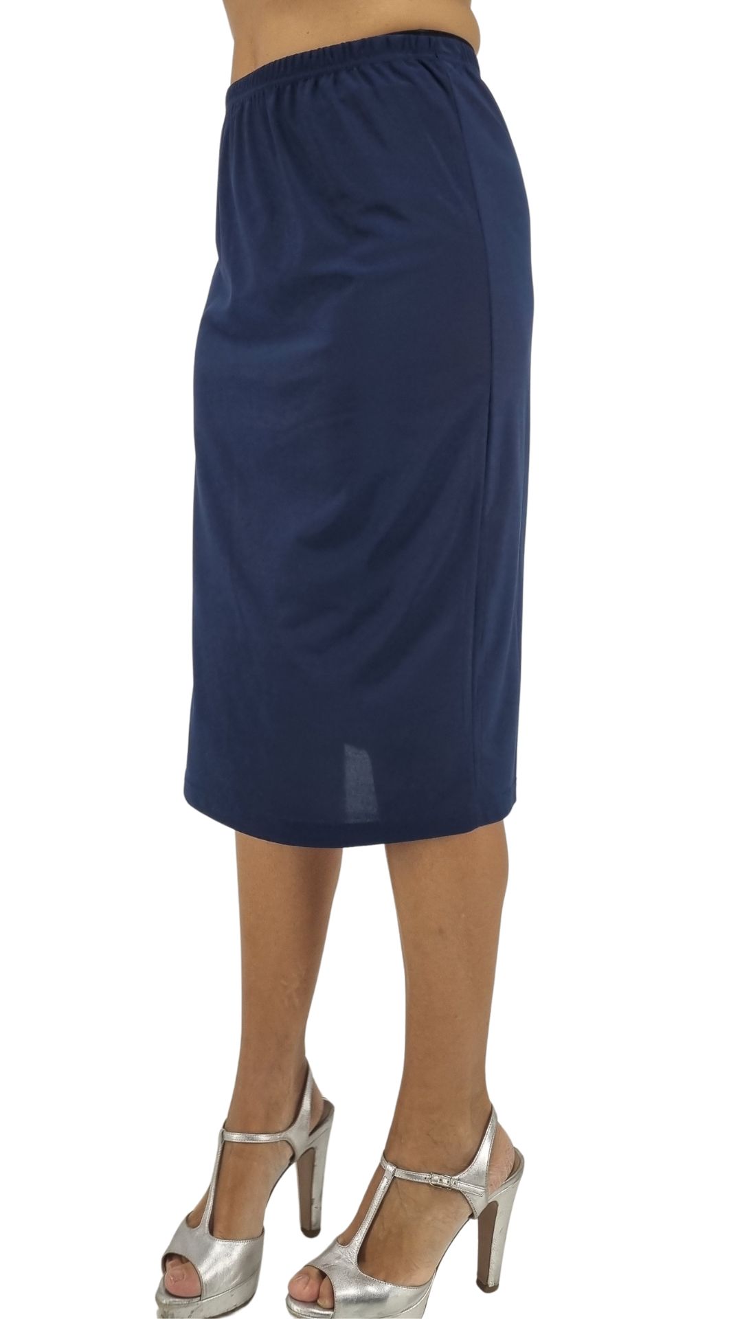 Gonna blu in jersey foderata con elastico in vita e spacchetto dietro.