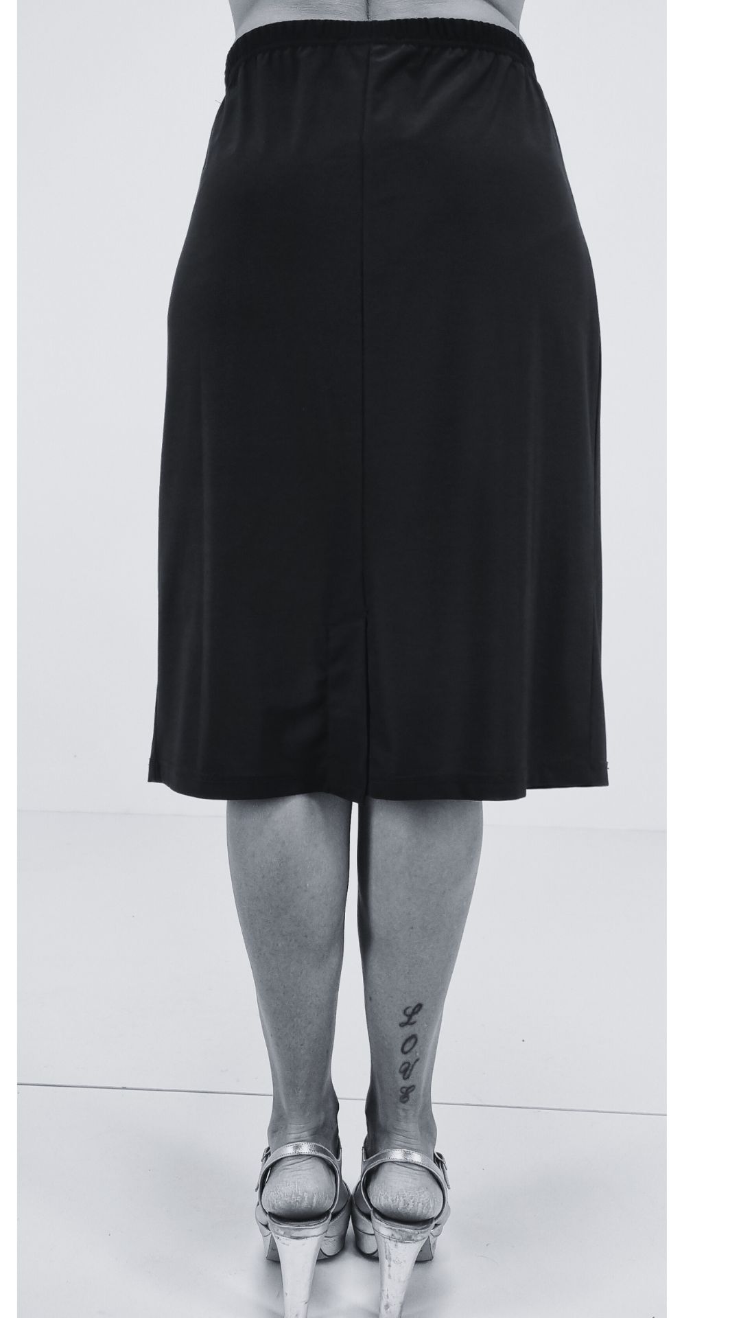 Gonna nera in jersey foderata con elastico in vita e spacchetto dietro.