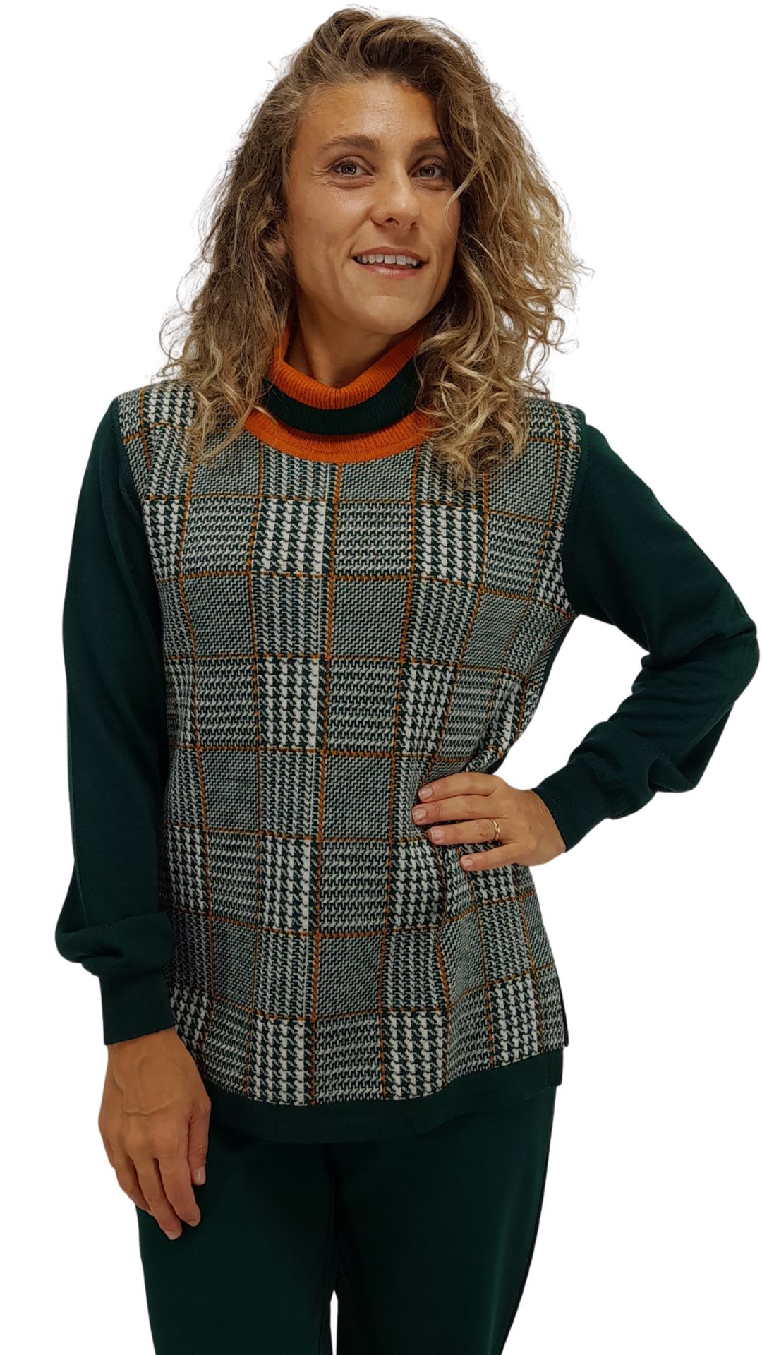 Davanti lavorazione Principe di Galles, colori arancio e verde bottiglia, come il collo a ciambella.