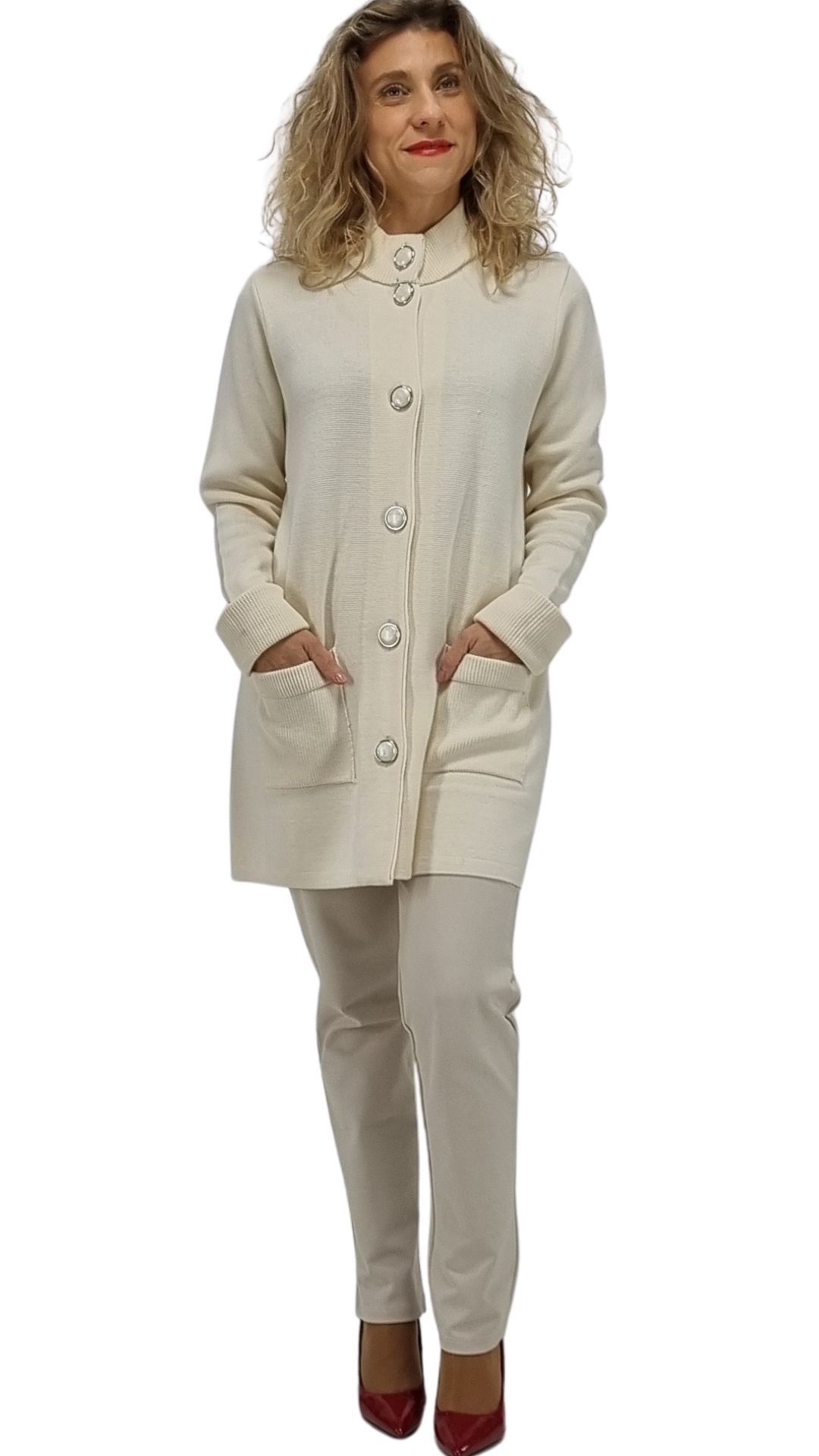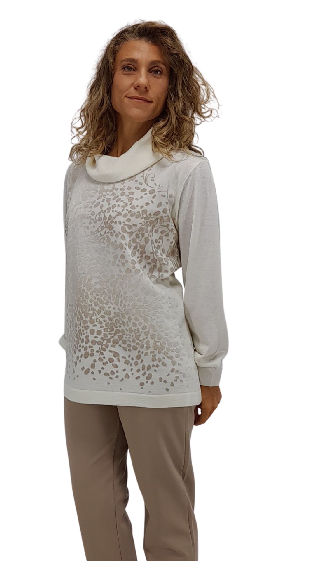 Maglia collo ciambella Lavorazione ricamo vellutino in rilievo Linea morbida Lunghezza al fianco.