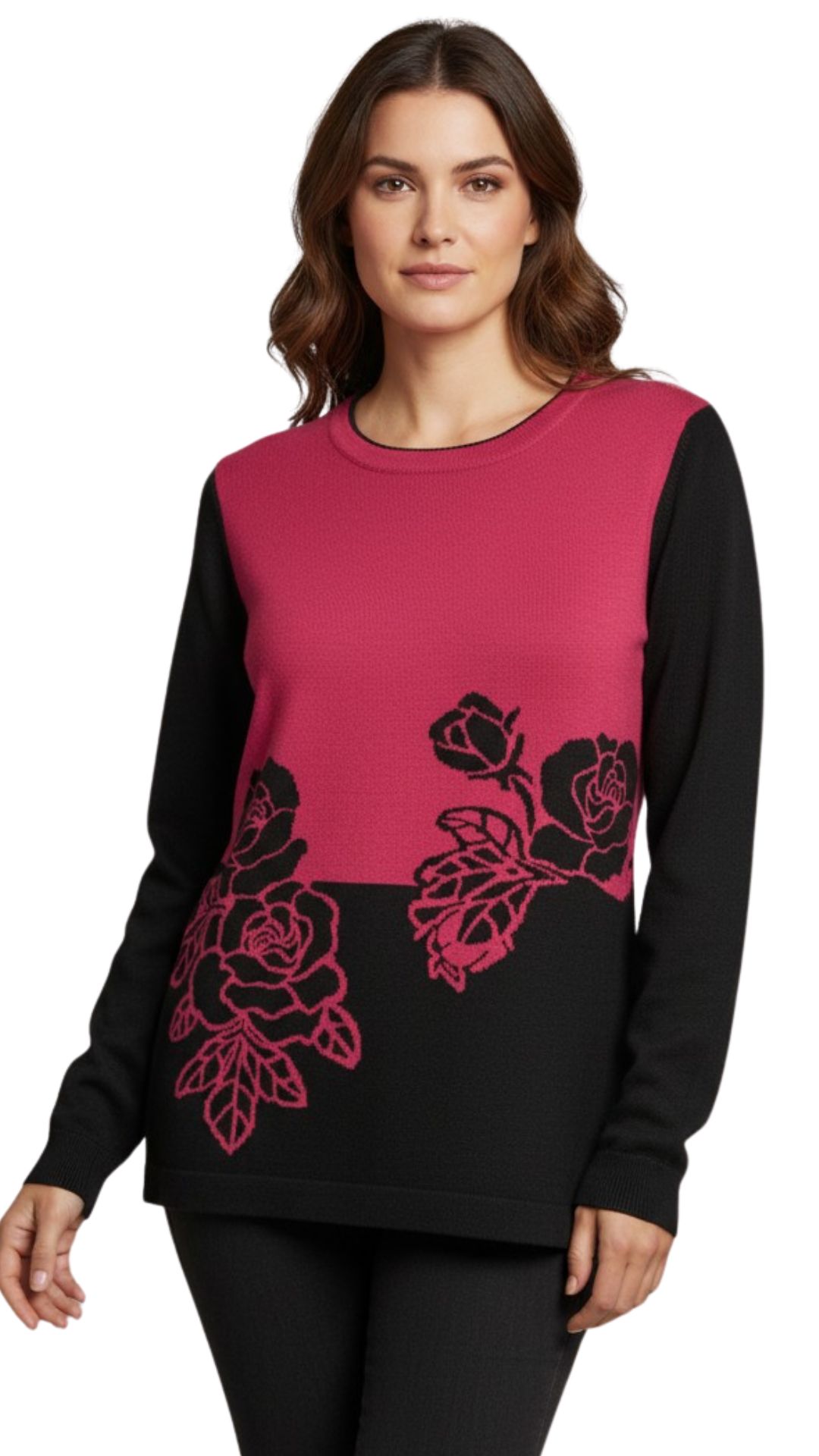 Maglia girocollo, sul davanti intersi -dietro e maniche tinta unita colore nero.Lunghezza al fianco, linea morbida .